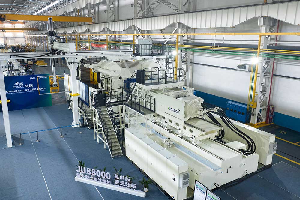 此次交付的海天JU系列8800吨超大型注塑机,额定锁模力达88000kN,注射容量达134000立方厘米,刷新行业纪录,实现了超大型注塑机研发制造能力的突破。